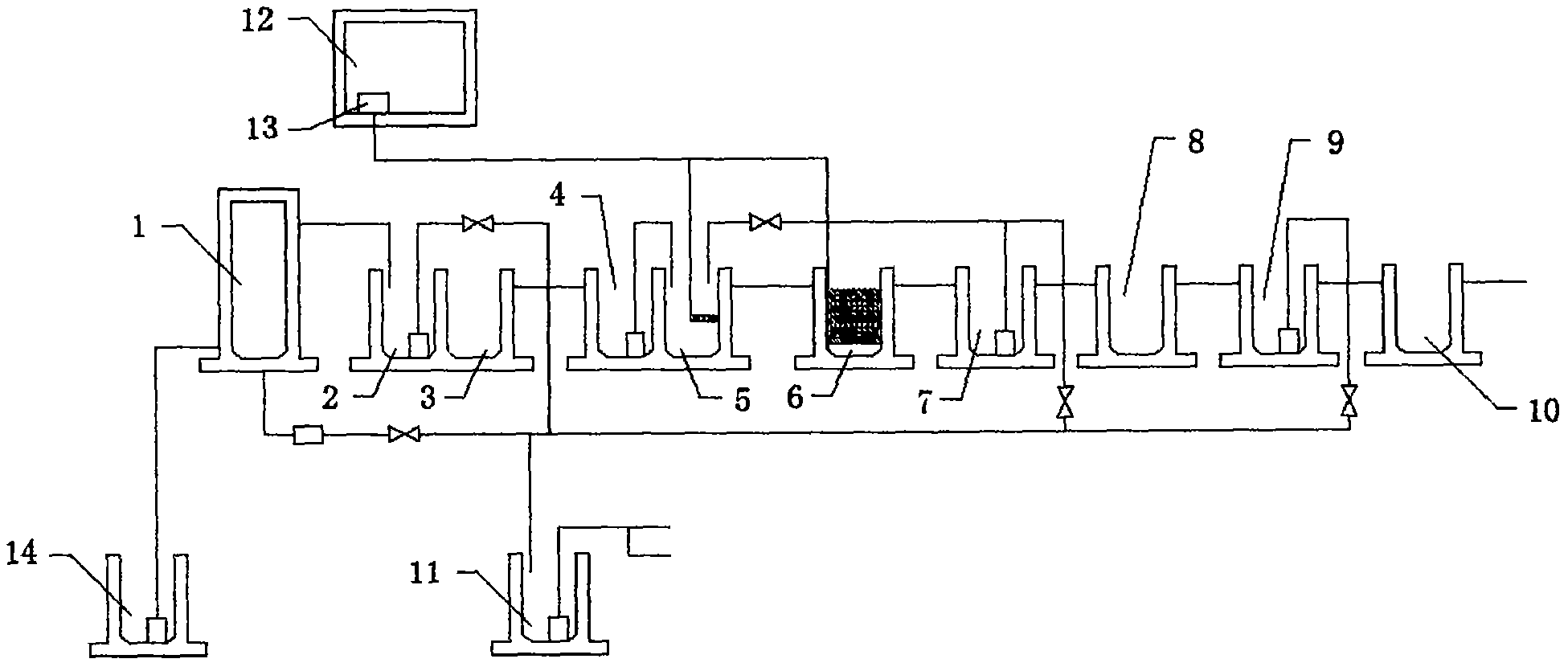 b、往初沉池(2)內(nèi)加入PAM或PAC,在初沉池(2)內(nèi)除去廢水中的可沉物和漂浮物,廢水中的污水流入緩沖池(3),然后從緩沖池(3)流入調(diào)節(jié)池(4),廢水中的污泥流入污泥凝縮池(11)內(nèi);