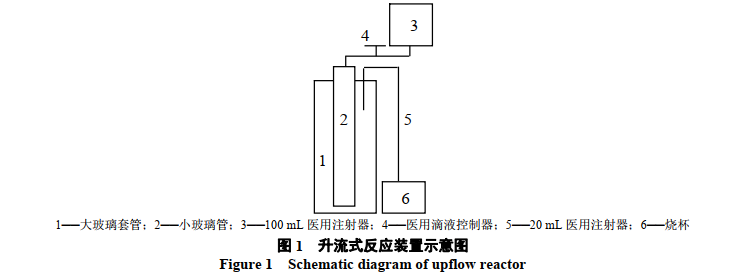 燒杯實驗采用3個500mL燒杯和2個100mL量筒。氫氧化鉻污泥和焦銅廢水混合后的總體積為500mL。污泥使用前充分攪拌均勻。將污泥從量筒中傾倒出來后,用另一量筒量取焦銅廢水多次清洗并倒入相應的燒杯中,防止量筒內殘留污泥。使用玻璃管、醫(yī)用注射器、鐵架臺等組裝簡易的升流式反應器。將小玻璃管(內徑6mm,高1000mm)固定放置于大玻璃柱(內徑30mm,高800mm)的中心,組成升流式反應器。100mL醫(yī)用注射器及滴液控制器共同控制焦銅廢水流速,20mL醫(yī)用注射器用于液體移出。