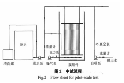 試驗采用一體式 MBR,膜組件采用中空纖維膜,接于微孔曝氣框架上,膜面積 1m2,膜孔徑