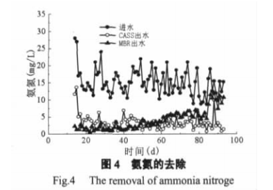 MBR 中試結果表明:污泥濃度控制在 7000~9700mg/L、溶解氧 2~3mg/L 時,HRT 可縮短到 2d,與 CASS 水力停留時間相比縮短了 3d, 但出水COD 仍維持在一較低水平,平均值為 79mg/L,平均去除率為 97%。MBR 工藝中硝化菌的富集強化了氨氮的去除,但因實驗在不排泥條件下進行,使得硝化菌活性降低,導致出水氨氮偏高,在保證硝化菌活性階段,平均值為 1.6mg/L;MBR 工藝較 CASS 工藝具有更優(yōu)的除磷性能,但除磷性能是有限的,說明在 MBR 工藝應用中除適當排泥外,還應考慮用化學方法以實現(xiàn)更優(yōu)的脫磷效果。