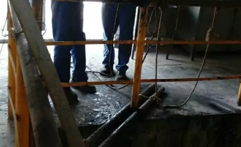 本次清淤作業(yè)從3#凈化開(kāi)始進(jìn)行,為確保安全作業(yè),需先對(duì)沉淀池水進(jìn)行排放,沉淀池中的水主要為電捕沖洗水和冷卻塔降溫回水,水中含有氫氧化鈉及一些化學(xué)藥劑,排放前必須對(duì)池低的水進(jìn)行人工攪拌,使水中的二氧化碳?xì)鈿膺M(jìn)行釋放,以防清淤人員在清污過(guò)程中窒息或暈倒。圖一 吊運(yùn)池底淤泥
