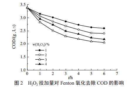 由圖2和表2可以看出,當(dāng)H2O2的投加量為3%時,COD的去除效果明顯高于H2O2的投加量為1%、2%、4%的情況。H2O2的適宜投加量為3%。
