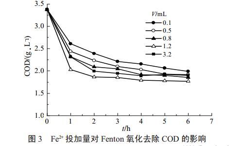 在反應(yīng)體系中,F(xiàn)e2+的投加量較小時,COD的去除效果會隨Fe2+的投加量的增加而增加,而Fe2+的投加量為3.2mL時,COD的去除效果卻變差。原因是Fe2+的投加量過高時,過量的Fe2+會與•OH反應(yīng)生成Fe3+和OH-,繼而沉淀,既影響H2O2的催化分解產(chǎn)生•OH,又消耗了部分•OH,影響COD的去除。不同F(xiàn)e2+投加量條件下F-產(chǎn)生情況與COD去除情況相類似,表明脫氟性能隨著Fe2+的增加會出現(xiàn)拐點(diǎn),并不是單純的正效應(yīng)。綜合以上結(jié)論,對于該氟化工廢水采用Fenton氧化工藝作為預(yù)處理工藝時,選擇1.2mL(114mmol/L)Fe2+投加量為宜。