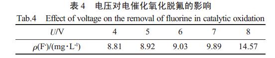 每100mL原水,調(diào)節(jié)pH為7,采用石墨電極,改變電壓,得到電壓對電催化氧化工藝COD去除性能以及脫氟性能的影響,如圖4和表4所示。