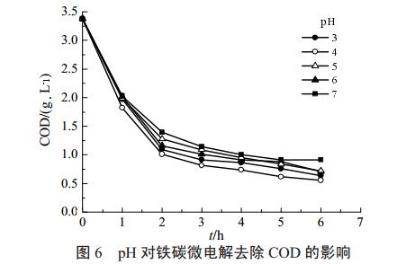反應(yīng)中,產(chǎn)生的了初生態(tài)的Fe2+和原子H,它們具有高化學(xué)活性,能改變廢水中許多有機(jī)物的結(jié)構(gòu)和特性,使有機(jī)物發(fā)生斷鏈、開環(huán)等作用,從而降解有機(jī)物[12]。由Fe2+氧化生成的Fe3+逐漸水解生成聚合度大的Fe(OH)3膠體絮凝劑,可以有效地吸附、凝聚水中的污染物,從而增強(qiáng)對廢水的凈化效果。因此廢水的pH太低,會影響Fe(OH)3膠體絮凝,繼而影響COD的 去除效果和除氟性能。故鐵碳微電解的適宜pH為4。