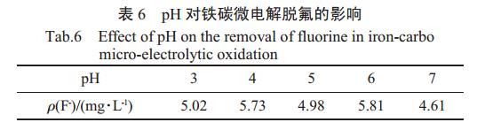 由圖6和表6可以看出,pH為4左右時,COD的去除效果和除氟性能要優(yōu)于pH為3、5、6、7的情況,由此確定最佳pH為4左右。