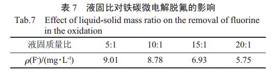取100mL原水,固定pH為4、鐵碳質(zhì)量比1:1,改變液固比,得液固比對鐵碳微電解COD去除性能以及脫氟性能的影響,如圖7和表7所示。