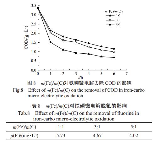 取100mL原水,固定pH為4、液固質(zhì)量比為5:1,改變鐵碳質(zhì)量比,得m(Fe)/m(C)對鐵碳微電解COD去除性能以及脫氟性能的影響,如圖8和表8所示。