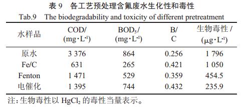 取各工藝以適宜條件進(jìn)行反應(yīng)6h,測定COD、BOD5及生物毒性,比較經(jīng)各工藝預(yù)處理后含氟廢水的可生化性和生物毒性,得表9。