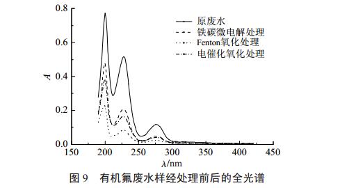 為了進(jìn)一步確認(rèn)所取有機(jī)氟廢水樣中有機(jī)氟污染物的去除效果,取原水以及各經(jīng)過3種氧化工藝處理的水樣進(jìn)行紫外-可見全光譜掃描(190~800nm),結(jié)果顯示各水樣在190~250nm內(nèi)有較大出峰,該波長范圍也是一般含氟有機(jī)物典型的出峰波長位置。具體結(jié)果見圖9。