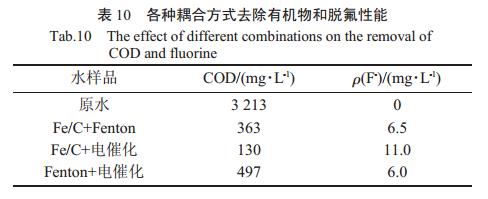 而在有機(jī)氟廢水的預(yù)處理過程中,關(guān)注的指標(biāo)主要是有機(jī)物的去除效果和脫氟性能,當(dāng)采取工藝耦合的方式,每種工藝以適宜條件下反應(yīng)6h,每種組合方式共反應(yīng)12h,3種耦合方式去除有機(jī)物和脫氟性能如表10所示。