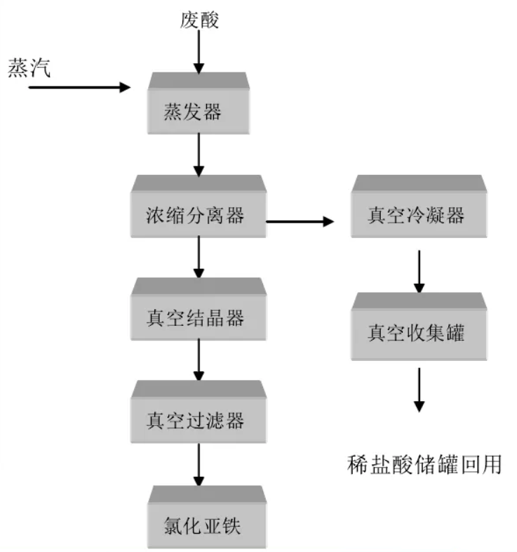 鋼鐵工業(yè)、金屬制品業(yè)在生產(chǎn)過程中需要清除鋼材表面氧化鐵皮而使用鹽酸進(jìn)行酸洗,酸洗過程中會產(chǎn)生大量的廢酸液,鹽酸酸洗廢液的成分主要是:游離酸、氯化亞鐵和水。平臺某技術(shù)方經(jīng)過多年的實(shí)驗(yàn)、研究、提出了負(fù)壓蒸發(fā)處理鹽酸廢液回收稀鹽酸和氯化亞鐵晶體的工藝方法。具體技術(shù)方法如下: