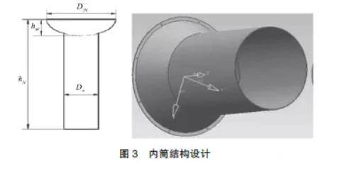 內(nèi)筒結(jié)構(gòu)設(shè)計(jì)是非常重要的環(huán)節(jié),內(nèi)筒的高度和直徑對于旋流氣浮分離器的性能具有重要的影響,球冠狀撇油槽的主要作用是裝置內(nèi)部液位高于撇油槽時(shí),油渣和氣泡的混合物經(jīng)溢流堰流入內(nèi)筒中,并且促進(jìn)氣泡和油滴的碰撞及聚合。球冠狀撇油槽上端面具有橢圓封頭的距離約為50mm,內(nèi)筒和外筒的直徑比一般為0.3~0.6,本文設(shè)計(jì)的直徑為外筒直徑的1/3,高度為外筒高度的1/2。內(nèi)筒結(jié)構(gòu)如圖3所示。
