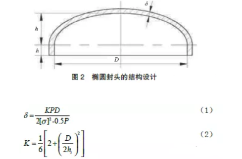 對于分離器封頭設(shè)計(jì)來說,橢圓形封頭是壓力容器使用最為廣泛的結(jié)構(gòu),橢圓形封頭沿著經(jīng)線各點(diǎn)的應(yīng)力是變化的,受力最大的點(diǎn)位于圓柱封頭的頂點(diǎn)處,橢圓形封頭可以達(dá)到與筒體相等的強(qiáng)度。橢圓封頭的結(jié)構(gòu)設(shè)計(jì)如圖2所示。橢圓形封頭的計(jì)算公式如式(1)所示。