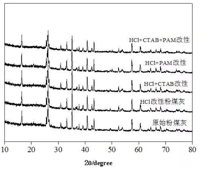 上圖為原始粉煤灰及改性粉煤灰的XRD譜圖。由圖可知,原始粉煤灰的X射線衍射譜圖與經(jīng)過(guò)改性的粉煤灰的X射線衍射譜圖相比,特征峰位置基本不變,這與粉煤灰是在高溫下形成的有很大關(guān)系,其在高溫下形成玻璃體結(jié)構(gòu)和組成成分很難改變。SiO2的特征衍射峰在26°附近,Al2O3的特征衍射峰在43°附近,Ca(OH)2的特征衍射峰在32°附近,峰面積與其含量有關(guān),含量越高,峰面積越大。由圖可知,SiO2的特征峰基本不變,說(shuō)明粉煤灰的基本玻璃體結(jié)構(gòu)大部分未被破壞。Al2O3和Ca(OH)2的特征衍射峰值略微減少,說(shuō)明HCl改性使其溶出,增大了粉煤灰的表面粗糙度,增加了吸附位點(diǎn),這與SEM圖表征結(jié)果一致。粉煤灰中玻璃體的含量可以由XRD圖譜上有許多分散的細(xì)小峰包的峰面積和峰范圍大小相對(duì)表示,由圖可得,粉煤灰的衍射強(qiáng)度降低,改性粉煤灰的峰包面積小于原始粉煤灰,說(shuō)明改性過(guò)后的玻璃體結(jié)構(gòu)部分被破壞。