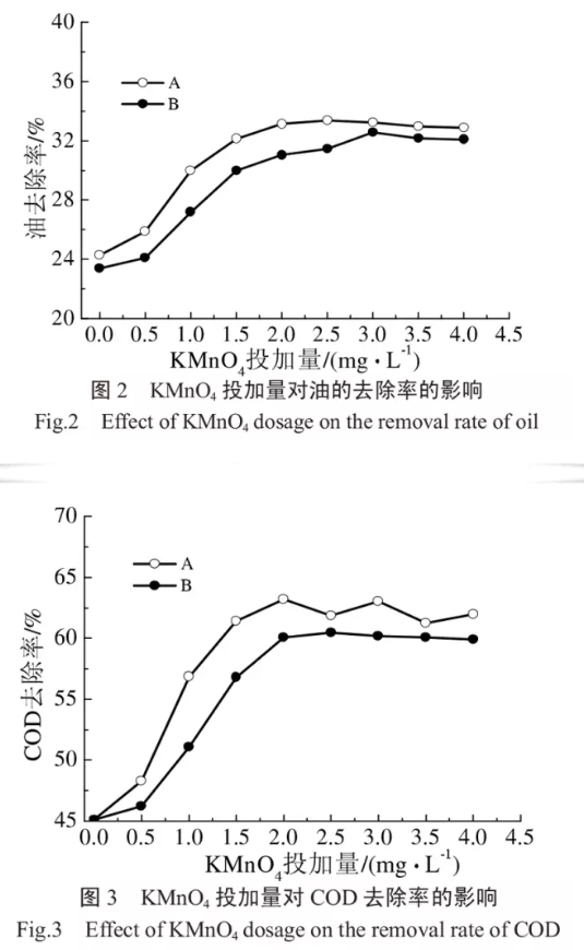 通過前期的燒杯實(shí)驗(yàn)已確定混凝劑PAC的最佳投量為90mg/L,在此混凝劑投量下,控制高錳酸鉀的投加量分別為0.5、1.0、1.5、2.0、2.5、3.0、3.5、4.0mg/L,并采用A、B兩種不同的投加方式:A:在混凝劑PAC之前投加高錳酸鉀;B:在混凝劑PAC之后投加高錳酸鉀。攪拌條件為:先以200r/min攪拌1min,再以100r/min攪拌3min,靜沉20min后,取液面下2cm處的上清液進(jìn)行分析測(cè)試?疾觳煌都臃绞、不同投量的高錳酸鉀對(duì)油和COD的去除效果的影響,實(shí)驗(yàn)結(jié)果如圖2和圖3所示。