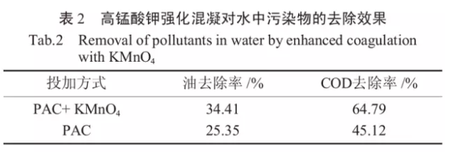 從表2可知,在相同的混凝反應(yīng)條件下,經(jīng)高錳酸鉀強(qiáng)化后油和COD的去除效果顯著,分別約提高了9.06%、19.67%,這說明高錳酸鉀強(qiáng)化混凝是可行的。分析其原因,主要是因?yàn)樵趐H為中性條件下,高錳酸鉀在直接氧化有機(jī)物的同時(shí),其還原產(chǎn)物新生態(tài)水合二氧化錳具有較長(zhǎng)的分子鏈和巨大的比表面積,能夠?qū)蛷U水中帶負(fù)電的膠體顆粒產(chǎn)生很強(qiáng)的吸附作用,從而能夠促使廢水中的膠體顆粒相互結(jié)合成更大的絮體,進(jìn)而達(dá)到提高對(duì)廢水中污染物的去除效果。