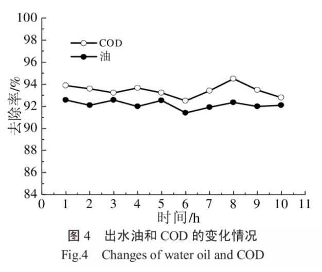 在組合工藝最佳運(yùn)行條件下,控制陶瓷平板膜膜通量為30L/(m²·h),運(yùn)行周期為正常運(yùn)行11min,反洗1min,反沖洗流量為120mL/min,系統(tǒng)連續(xù)運(yùn)行10h,定時(shí)對(duì)水質(zhì)進(jìn)行檢測(cè),考察曝氣/強(qiáng)化混凝/陶瓷膜微濾組合工藝對(duì)含油廢水中油和COD的去除效果,結(jié)果如圖4所示。