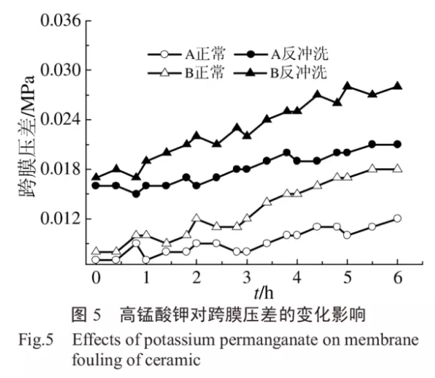 在室溫條件下,pH=7.0,控制膜通量30L/(m²·h),運(yùn)行周期為正常運(yùn)行11min,反洗1min,反沖洗流量為45mL/min。對(duì)比投加高錳酸鉀(A)與不投加高錳酸鉀(B)兩工藝跨膜壓差的變化,兩工藝連續(xù)運(yùn)行6h,考察高錳酸鉀對(duì)陶瓷平板膜過濾時(shí)跨膜壓差的影響,兩種工藝連續(xù)運(yùn)行時(shí)的跨膜的變化情況如圖5所示,圖中數(shù)字均為絕對(duì)值。