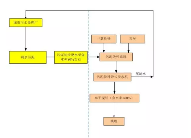 污水處理廠產(chǎn)生的污泥經(jīng)過帶式壓濾機、離心機或疊螺脫水機等傳統(tǒng)脫水機械初步脫水至含水率80%左右后,進入污泥改性系統(tǒng),污泥改性系統(tǒng)中添加三氯化鐵和石灰,并與污泥進行反應(yīng),達到改善污泥脫水性能的目的,在進入污泥特種帶式脫水機進行高壓壓榨,可以將含水率降至60%以下,壓濾水返回污水處理廠進行處理。