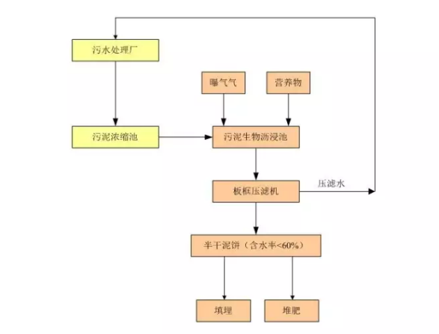 污水處理廠產(chǎn)生的污泥經(jīng)過污泥濃縮后,進入污泥生物改性池,在污泥改性池中投加專用復(fù)合菌劑,并曝氣,經(jīng)過兩天的反應(yīng),污泥的臭味消失,污泥脫水性能大大改善,通過板框壓濾機壓濾后,可將污泥含水率降至60%以下。含水率小于60%的泥餅可以填埋,也可以堆肥后作為肥料。