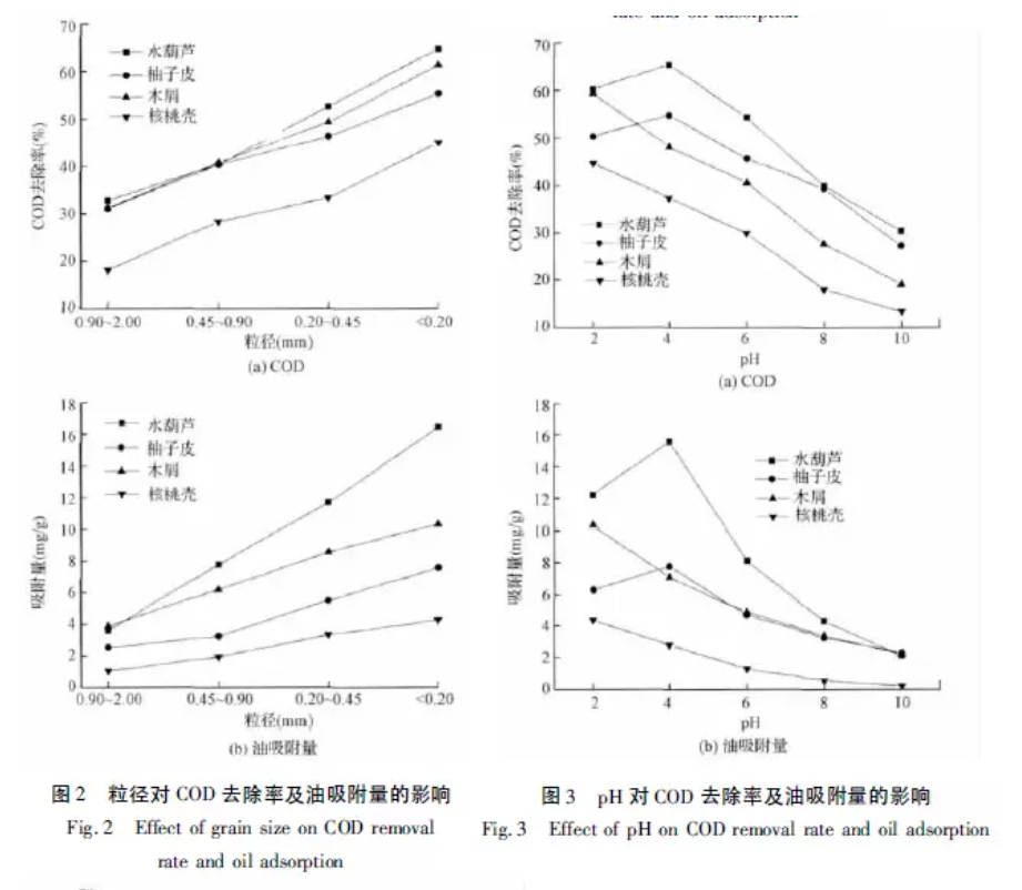 由圖2可知,生物質(zhì)粒徑越小,處理效果越好,粒徑<0.2mm時(shí)處理效果最優(yōu);這與相關(guān)研究吻合,顆粒粒徑減小,總表面積增大,增加了生物質(zhì)在外表面的吸附幾率,而粒徑越大,傳質(zhì)擴(kuò)散阻力越大,影響處理效果。粒徑越小,材料整體毛細(xì)孔越豐富,根據(jù)毛細(xì)管凝聚理論,微孔有利于油脂之間相互作用,所以當(dāng)粒徑較小時(shí)不僅有表面吸附作用,可能還會產(chǎn)生微孔填充效應(yīng),從而增加處理材料對有機(jī)物和油脂的吸附量。而同一粒徑下,處理效果由大到小分別水葫蘆、木屑、柚子皮、核桃殼;水葫蘆對COD的去除率達(dá)到65%左右、油脂吸附量為16.42mg/g。
