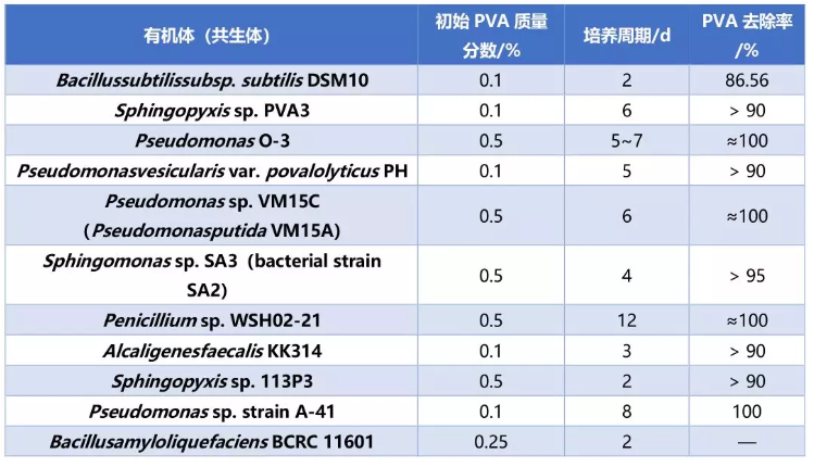 盡管PVA高效降解菌對(duì)PVA的降解率較高,但由于PVA降解菌種類不多、酶活性不高、提取不易以及培養(yǎng)周期較長等原因,嚴(yán)重影響了PVA高效降解菌的篩選與擴(kuò)增,致使其應(yīng)用仍面臨不小的挑戰(zhàn)。