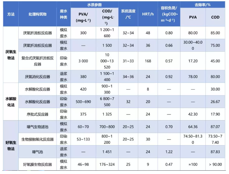 厭氧生物法、水解酸化法和好氧生物法處理含PVA廢水的效果見表3。