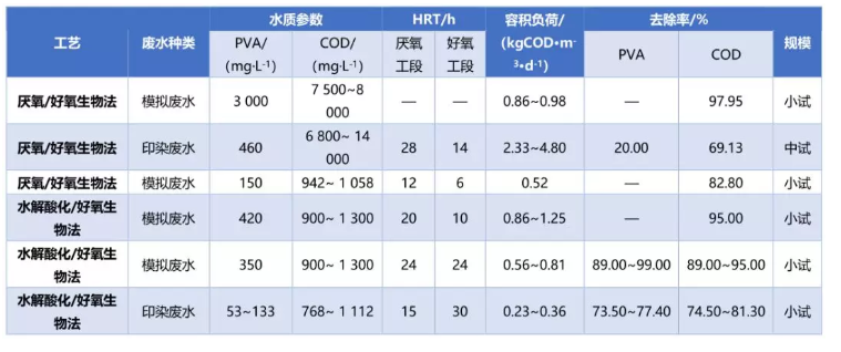 表4生物法聯(lián)合工藝處理含PVA廢水效果