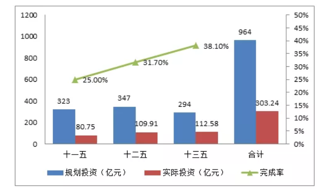 實(shí)際投入有多少呢?根據(jù)住建部統(tǒng)計(jì)年鑒中的數(shù)據(jù)顯示(圖2是污泥處理處置規(guī)劃投資與實(shí)際投資對(duì)比圖),“十二五”期間我國(guó)我污泥的固定資產(chǎn)投資只有110億元,僅完成了31.7%的指標(biāo),這正好與我國(guó)“十二五”末31%-35%的污泥無(wú)害化處理處置率相吻合。而在“十一五”期間,污泥處理處置問(wèn)題還沒(méi)有引起足夠的重視,所以實(shí)際投資率更低,按25%的投資率估算,“十一五”期間我們估計(jì)約投資80億元,所以“十一五”、“十二五”污泥處理處置的總投資不超過(guò)200億元,僅不到計(jì)劃規(guī)劃投資的30%;預(yù)計(jì)“十三五”末投資額達(dá)到113億元,仍然不能完成目標(biāo)投資。