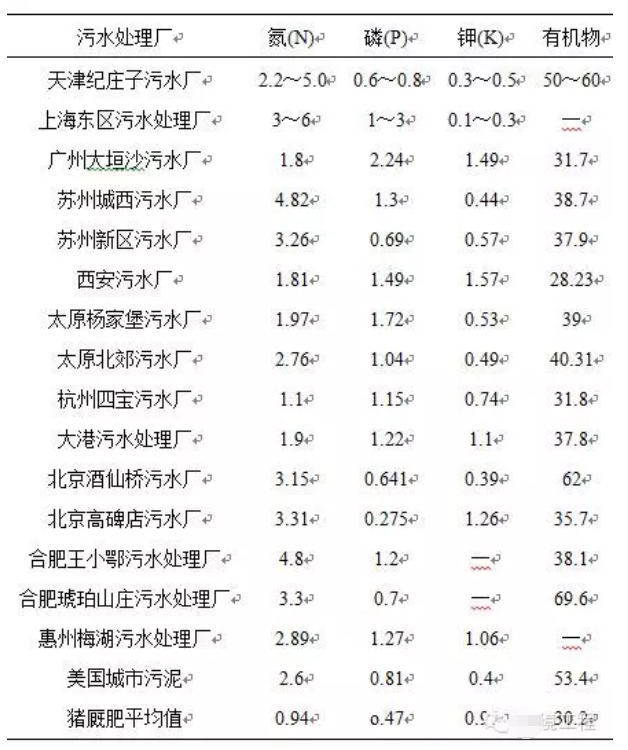 表2列出了我國(guó)部分城市的污泥的有機(jī)物和營(yíng)養(yǎng)物質(zhì)含量以及與美國(guó)和豬廄肥的對(duì)比,從表中可以得出污泥完全可以作為有機(jī)肥料來使用。