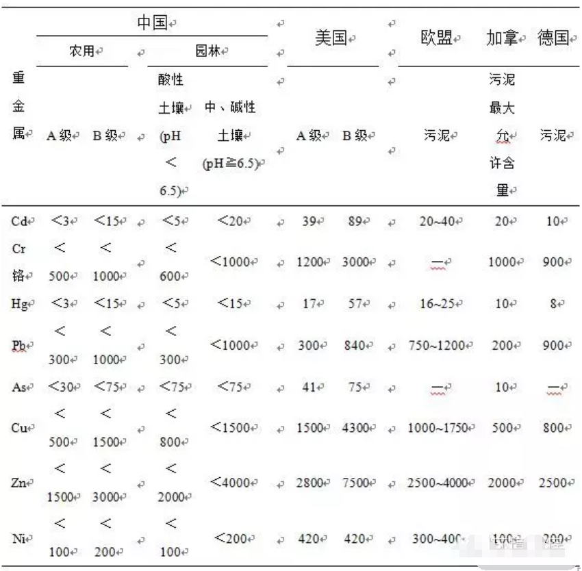 2006年,中國(guó)科學(xué)院地理科學(xué)與資源研究所從全國(guó)范圍內(nèi)選取了107個(gè)城市污水處理廠的污泥樣品,測(cè)定其重金屬含量。結(jié)果表明,中國(guó)城市污泥中As、Cd、Cr、Cu、Hg、Ni、Pb和Zn的含量,與2001年以前的調(diào)查結(jié)果相比總體上呈下降趨勢(shì),與我國(guó)《農(nóng)用污泥中污染物控制標(biāo)準(zhǔn)》相比,當(dāng)前我國(guó)城市污泥重金屬的超標(biāo)率很低,我國(guó)城市污泥中的重金屬污染風(fēng)險(xiǎn)并不高,絕大部分可以經(jīng)過無害化處理后進(jìn)行土地利用。表3是我國(guó)污泥土地利用重金屬的控制和其他幾個(gè)國(guó)家的對(duì)比,其中可以看出我國(guó)對(duì)施用污泥重金屬的控制還是相對(duì)嚴(yán)格的。