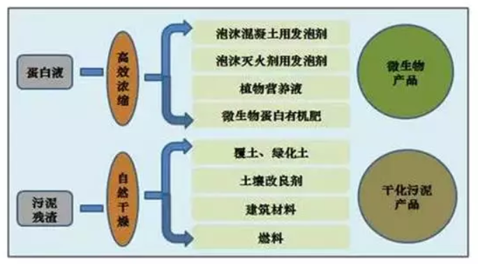 污泥經(jīng)水解處理后,其含蛋白液體經(jīng)濃縮后可作為蛋白發(fā)泡劑和有機肥等利用,污泥殘渣可用做覆土、綠化土、土壤改良劑和建筑材料等。