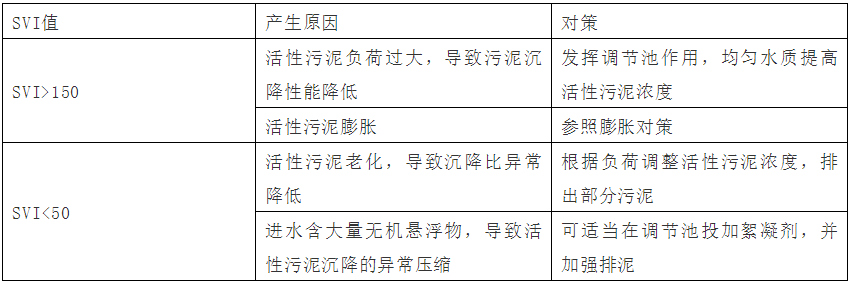 污泥體積指數(shù)SVI=SV30/MLSS,SVI在50~150為正常值,對于工業(yè)廢水可以高至200;钚晕勰囿w積指數(shù)超過200,可以判定活性污泥結(jié)構(gòu)松散,沉淀性能轉(zhuǎn)差,有污泥膨脹的跡象。當SVI低于50時,可以判定污泥老化需要縮短污泥齡。