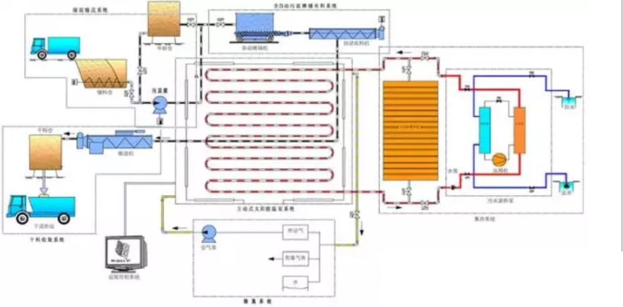 新能源污泥干化成套設(shè)備是自主研發(fā)的用于污泥干化處理的設(shè)備,該設(shè)備主要以太陽能和中水熱能作為主要熱源對污泥進(jìn)行干化處理;采用企業(yè)自主研發(fā)的長齒條式攤鋪機(jī)對污泥進(jìn)行布料、翻拌、收料;利用先進(jìn)的自動控制技術(shù)與數(shù)控采集和調(diào)整理論相結(jié)合;與先進(jìn)的實(shí)驗(yàn)監(jiān)測設(shè)備及儀器所監(jiān)測的結(jié)果相對比,確定科學(xué)的污泥泵送、自動布料、自動翻拌、自動收料等工序,最終達(dá)到太陽能和地?zé)崮茏罴雅浔壤茫瑢?shí)現(xiàn)污泥干化處理的高效穩(wěn)定。