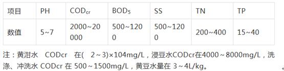 在豆腐生產(chǎn)過程中,廢水主要來自水洗、浸泡和壓濾工序,以及部分沖洗水,其中水質(zhì)及水量如表所示。