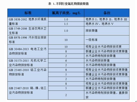 地表水、生活飲用水、污水及含氟工業(yè)廢水的排放標(biāo)準(zhǔn)如表1所示。