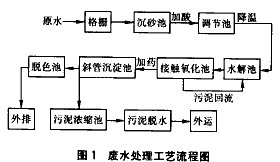 一般情況下,接觸氧化池的出水CODCr和SS還比較高,在進(jìn)入斜管沉淀池時(shí)要投加PAC和PHP,投加量可根據(jù)經(jīng)驗(yàn)或做小試確定。當(dāng)水質(zhì)變化較大時(shí),要加大PAC和PHP的投加量。沉淀池出水色度有時(shí)偏高,還要在脫色池中投加漂白水進(jìn)一步去除色度。因?yàn)槌恋沓夭捎眯惫,表面?fù)荷較小,但出水中SS一般能達(dá)標(biāo)。沉淀池中的污泥排入污泥濃縮池中濃縮,再經(jīng)板框壓濾機(jī)脫水。
