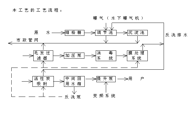 ![]() 方案簡介: 1. 細(xì)格柵:自己制作為細(xì)網(wǎng)狀或直接向廠家定做 2. 調(diào)節(jié)池一般設(shè)計(jì)為1.5-2.0h的水力停留時(shí)間,并向其內(nèi)曝氣(為了減輕調(diào)節(jié)池發(fā)生厭氧反應(yīng)而產(chǎn)生的異味),一般采用水下曝氣機(jī)。池底設(shè)有放空管,池頂設(shè)有溢流孔。 3. 沉淀池一般設(shè)計(jì)為0.5-0.8h的水力停留時(shí)間,池子以斗形為宜,池底設(shè)有放空管或設(shè)一流量較小的排污泵亦可,池頂設(shè)有溢流孔,調(diào)節(jié)池與沉淀池的污水經(jīng)過地下排污溝排到排污池經(jīng)排污泵排入市政管網(wǎng)。 4. 毛發(fā)過濾器,以小孔徑的毛發(fā)過濾器為宜,截留原水中的毛發(fā)等大的顆粒物,為保護(hù)后續(xù)膜設(shè)備而設(shè),其自設(shè)反洗管管路,可設(shè)計(jì)為每天反洗一次,每次10分鐘。 5. 加壓泵為一備一用而設(shè)(本工藝采用流量為16m3/h,揚(yáng)程80m,功率5.5Kw,南方泵業(yè)CDL16-100)為后續(xù)系統(tǒng)增壓而設(shè)。 6. 消毒設(shè)備(本工藝消毒設(shè)備為專利技術(shù),市場很難買到,其主要作用是去除原水中的有害微生物、細(xì)菌等對人體有害菌)可采用臭氧強(qiáng)氧化劑。 7. 膜處理系統(tǒng),主要采用中空纖維膜(本工藝中采用8根Φ200的中空纖維膜,其進(jìn)水流量維持在12 m3/h,出水維持在10 m3/h左右,本系統(tǒng)原設(shè)計(jì)為每天反洗一次,但實(shí)際運(yùn)行2個月后,效果不理想,改為每小時(shí)反洗10分鐘,保護(hù)中空纖維膜),以后設(shè)計(jì)在前期設(shè)計(jì)的水要經(jīng)過十分精細(xì)的過濾,這樣不會使膜堵塞,保持系統(tǒng)的正常運(yùn)行。其運(yùn)行壓力為0.1-0.3MPa。 8. 活性炭吸附,由膜出來的水經(jīng)過活性炭吸附,去臭、去味還可吸附水中的膠體物質(zhì)(如果活性炭吸附系統(tǒng)前置在膜系統(tǒng)之前則1公斤活性炭處理水量8-12噸,活性炭的壽命會很短,很快更換活性炭,而其后置則為前置的20倍左右,提高活性炭的使用壽命,活性炭后置脫氯1公斤活性炭處理水量30噸左右,做直飲水時(shí)亦如此)本工藝活性炭罐設(shè)計(jì)為每天反洗一次,每次10分鐘,罐體設(shè)計(jì)為Φ1600,有效高度為2000,凈高2800,實(shí)際裝填量為75%。 9. 中水回用池設(shè)計(jì)為3小時(shí)的水力停留時(shí)間,在中水回用池底設(shè)有放空管,頂部設(shè)有溢流孔,中水回用池上部設(shè)有自來水補(bǔ)給管道。 10. 提升泵,本工藝供給4座辦公樓沖廁用水,有高層和低層,故選用南方泵業(yè)型號為CDL4-60與CDL4-140(立式泵)并選用CDL4-140一臺做為前面的幾個系統(tǒng)的反洗泵。 電器控制部分: 電器控制部分可分為控制加壓泵運(yùn)行、提升泵運(yùn)行以及反洗幾個方面。 、 加壓泵受沉淀池和中水回用池內(nèi)的液位控制器來控制:<1>.若沉淀池內(nèi)水位達(dá)到設(shè)計(jì)要求而回用池內(nèi)水位較低,加壓泵運(yùn)行;若沉淀池內(nèi)水位未達(dá)到設(shè)計(jì)水位,回用池內(nèi)水位較低,加壓泵不運(yùn)行,自來水補(bǔ)給閥門打開。<2>.沉淀池內(nèi)水位未達(dá)到設(shè)計(jì)要求,而回用池內(nèi)水位達(dá)到設(shè)計(jì)要求,加壓泵不運(yùn)行;沉淀池內(nèi)水位未達(dá)到設(shè)計(jì)要求,而回用池內(nèi)水位達(dá)到設(shè)計(jì)要求,加壓泵不運(yùn)行。 、 提升泵受各樓中水水箱內(nèi)的液位控制器的控制以及中水回用池內(nèi)液位控制器的控制:<1>.中水回用池內(nèi)處于低水位時(shí),提升泵不運(yùn)行;<2>.中水回用池內(nèi)水位達(dá)到設(shè)計(jì)要求,各樓中水水箱內(nèi)水位處于高水位時(shí),提升泵不運(yùn)行,處于低水位時(shí),提升泵運(yùn)行。 ③ 反洗方面,在系統(tǒng)正常工作時(shí),毛發(fā)過濾器、膜系統(tǒng)以及活性炭系統(tǒng)的正常出水的電磁閥打開,反洗電磁閥關(guān)閉,每天設(shè)定的反洗程序啟動,毛發(fā)過濾器、膜系統(tǒng)以及活性炭系統(tǒng)的正常出水的電磁閥關(guān)閉打開:<1>.首先是活性炭罐的反洗閥門打開,進(jìn)行反洗;<2>.其次是膜系統(tǒng)的反洗閥門打開,進(jìn)行反洗;<3>.最后是毛發(fā)過濾器的反洗閥門打開進(jìn)行反洗。 、 排污坑內(nèi)設(shè)一液位器,來排掉從調(diào)節(jié)池、沉淀池、回用池以及從毛發(fā)過濾器內(nèi)排出的污水。 本工藝較傳統(tǒng)的活性污泥法相比較優(yōu)點(diǎn)在: 1. 出水水質(zhì)明顯優(yōu)于活性污泥法的出水水質(zhì); 2. 占地面積小,比活性污泥法的占地面積節(jié)省50%以上; 3. 運(yùn)行簡單,基本可實(shí)現(xiàn)無人職守; 4. 不受溫度、水量的變化; 5. 設(shè)備結(jié)構(gòu)緊湊,可根據(jù)實(shí)際情況連續(xù)運(yùn)行,易維護(hù)。 本工藝易產(chǎn)生的現(xiàn)象是運(yùn)行時(shí)膜系統(tǒng)易堵塞,要求前期水質(zhì)較好。 |