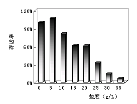 ![]() 2.2 淡水微生物在不同鹽度下的存活率 不同生活在淡水環(huán)境下或者淡水處理構筑物中的微生物接種到高鹽環(huán)境下,僅有部分微生物存活。這是鹽度對微生物的一種選擇。將淡水微生物的存活率定義為100%,當鹽度超過20g/L,其存活率低于40%。因此,當鹽度超過20g/:L,一般認為用不同淡水微生物無法進行處理。