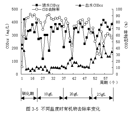 ![]() 3 適鹽微生物的分類與利用 耐鹽微生物:能耐受一定濃度的鹽溶液,但在無鹽條件下生長最好,其生長也不需要大量無機鹽。 ![]() ![]() 此圖為部分適鹽微生物形態(tài)的電鏡圖 4 生物處理高鹽污水遇到的問題 鹽度適應差 傳統(tǒng)活性污泥法馴化處理鹽度低于2%含鹽廢水。 當鹽度環(huán)境變?yōu)榈h(huán)境時,污泥的適應性會很快消失。 鹽度變化影響大 鹽度在0.5~2%變化通常會對處理系統(tǒng)產生嚴重的干擾。 突然變化鹽度比逐漸變化鹽度對系統(tǒng)的干擾更大 從高鹽變?yōu)闊o鹽產生影響比低鹽環(huán)境變?yōu)楦啕}環(huán)境產生的影響要大 降解速率緩慢 隨著鹽度的升高有機物降解速率下降,因此低F/M更適合含鹽廢水的處理。圖3.5為SBR法處理在各鹽度下的處理效果。 污泥流失嚴重 鹽度改變污泥中微生物的組成,改變了污泥的沉淀性和出水SS,污泥流失嚴重.