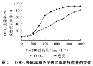 在設(shè)計(jì)的實(shí)驗(yàn)方法和條件下,固定水樣為1000mL,通過(guò)改變Y280的投加量得到不同澄清度的上清液,加藥量與上清液的CODcr、色度之間的關(guān)系見(jiàn)圖1和圖2。