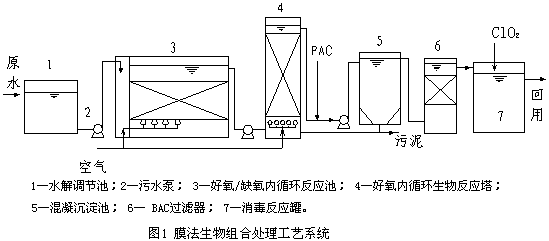 由于廢水水質(zhì)和水量波動大,不利于生物處理,因此生化處理前必須設水解調(diào)節(jié)池,確保生物后續(xù)處理作用穩(wěn)定。由于排放的廢水對一般好氧菌有明顯的抑制性,COD去除效果差。因此,在曝氣生化塔前設倒置的膜微孔曝氣生物接觸氧化A/O 反應池,確保有機物在生物組合反應器內(nèi)得到較充分降解,去除大部分COD,同時提高廢水的可生物降解性,為后續(xù)好氧生物處理創(chuàng)造有利條件。廢水經(jīng)倒置的膜微孔曝氣生物接觸氧化A/O工藝處理后,COD去除率高,可生化性提高,對后續(xù)好氧生物也無抑制作用,因此有利于進行后續(xù)好氧生物處理。在膜微孔曝氣生化塔內(nèi)充分曝氣供氧的條件下,廢水中剩余的有機物在好氧菌作用下充分利用水中溶解氧得到充分降解和去除,廢水COD達回用要求。好氧生化塔處理后出水仍含有一定量的懸浮物、細菌和雜質(zhì),需再經(jīng)過后續(xù)物化混凝和和活性炭過濾處理,通過生物絮凝和物化混凝協(xié)同作用,將水中的懸浮物雜質(zhì)細菌和部分難降解有機物有效除去,使出水COD等指標達回用水質(zhì)要求。