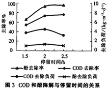 從表4數(shù)據(jù)發(fā)現(xiàn),因?yàn)閷?shí)驗(yàn)采用的是好氧生化,酚、S2-及BOD5這些易于氧化的物質(zhì)或指標(biāo)去除效果最好,NH3-N則沒有得到降解,其它如COD和油也有不同程度的降解。 2.2 水力停留時(shí)間與去除效果的關(guān)系 圖3描述了停留時(shí)間對(duì)COD和酚降解的影響情況,可知,在一定范圍內(nèi),停留時(shí)間對(duì)COD和酚的去除率影響不大,均有較好的出水水質(zhì)和較高的去除率;進(jìn)一步發(fā)現(xiàn),當(dāng)停留時(shí)間從2.5h減小到2.0h后,COD的平均去除率雖由76.0%降到73.6%,但它的去除負(fù)荷卻由3.22kg/(m.d) 升高到4.49kg/(m·d);酚的平均去除率雖由95.5%降到93.8%,但它的去除負(fù)荷卻由1.08 kg/(m3.d) 升高到1.39kg/(m3·d);但是,如果停留時(shí)間再進(jìn)一步減小到1.5h,則降解效果明顯下降。本實(shí)驗(yàn)的目的在于尋求一種高效的含酚廢水的處理方式及較適宜的水力停留時(shí)間,使大部分的COD尤其酚得到降解,防止這些污染物在后續(xù)的綜合生化處理中產(chǎn)生沖擊,顯然,當(dāng)水力停留時(shí)間為2.0h時(shí),就已經(jīng)達(dá)到了目的:出水中酚的平均質(zhì)量濃度為8.5 mg/L,平均去降率達(dá)到93%,而且此時(shí)COD和酚的去除負(fù)荷相對(duì)也大。