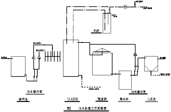 采用厭氧(UASB)——好氧(滴濾床)工藝對該廢水進(jìn)行處理,其工藝流程見圖1。