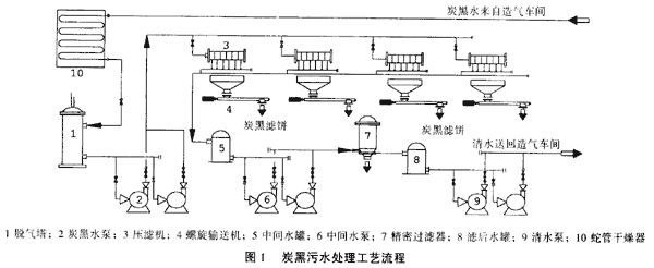 造氣車間重油氣化后,產(chǎn)生的炭黑水利用自身余壓將炭黑水送往炭黑回收車間,經(jīng)蛇管于燥器換熱后進(jìn)入脫氣塔,去除水中夾帶的CO,H2等氣體,污水經(jīng)炭黑水泵加壓后送入壓濾機(jī)過濾后,炭黑濾餅存留在濾板中,由人工拉開濾板,將濾餅卸到料斗內(nèi),經(jīng)螺旋輸送機(jī)送往干燥廠房?jī)?nèi)進(jìn)行干燥處理后,裝袋入庫,濾后水經(jīng)中間水泵加壓后送入精密過濾器過濾,濾后清水流入清水箱,送回造氣車間循環(huán)使用,和原有工藝相比每小時(shí)節(jié)約軟水約50t,流程見圖1。