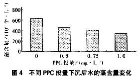 圖4表明PPC預氧化具有較好的除藻效能,且隨著PPC藥劑投量的增加、沉后水藻含量逐漸下降,當PPC投量增加到1.0mg/L時,沉后水藻含量降為335×104個/L,比常規(guī)混凝處理下降了46.4%。