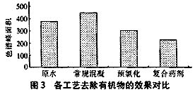 試驗比較了PPC預處理工藝、常規(guī)工藝、預氯化加粉末活性炭工藝(以下簡稱Cl2+PAC工藝)的除有機污染物效能。
