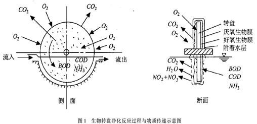 由電機、變速器和傳動鏈條等組成的傳動裝置驅(qū)動轉(zhuǎn)盤以較低的線速度在槽內(nèi)轉(zhuǎn)動,并交替地和空氣與污水相接觸。接觸反應槽內(nèi)充滿污水,轉(zhuǎn)盤經(jīng)一段時間轉(zhuǎn)動后,會在其上附著一層滋生著大量微生物的生物膜,微生物的種屬逐漸穩(wěn)定,微生物的新陳代謝功能也逐步地發(fā)揮出來并達到穩(wěn)定的程度,污水中的有機污染物為生物膜所吸附降解。轉(zhuǎn)盤轉(zhuǎn)動離開污水與空氣接觸,生物膜上的附著水層從空氣中吸收氧,并將其傳遞到生物膜和污水中,使槽內(nèi)污水的溶解氧含量達到一定的濃度,為生物降解提供充足的氧。在轉(zhuǎn)盤上附著的生物膜與污水以及空氣之間,除有機物(BOD、COD)與O2外,還進行著其它物質(zhì),如CO2、NH3等的傳遞,其原理如圖1所示。