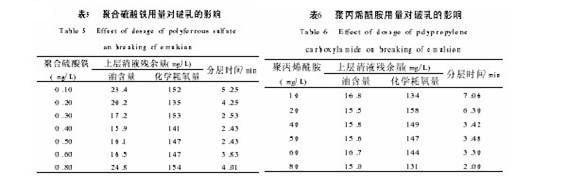 在實(shí)驗條件為:pH始=1.5,pH終=7.0,聚合硫酸鐵為0.40mg L,考察聚丙烯酰胺用量對破乳的影響,結(jié)果見表6。